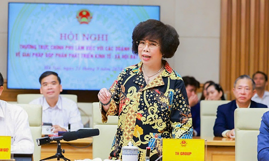Bà Thái Hương, Chủ tịch Hội đồng Chiến lược tập đoàn TH đề xuất xây dựng Luật Dinh dưỡng học đường, tại hội nghị Thường trực Chính phủ làm việc với doanh nghiệp sáng 21/9.