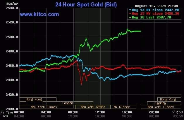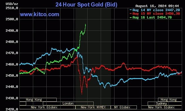 Tối 16/8, giá vàng thế giới giao ngay tăng vọt ngay khi phiên Mỹ vừa mở cửa, hiện lên kỷ lục 2.494 USD một ounce.